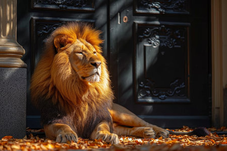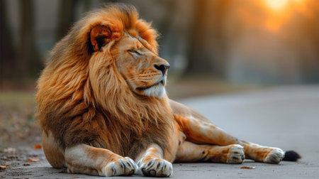A lion lies comfortably among fallen autumn leaves, basking in the warm glow of the sunset in a peaceful forest.
