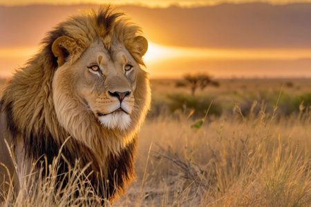 Majestic lion gazes toward the viewer, its golden mane illuminated beautifully by a warm sunset glow, creating a striking atmosphere.