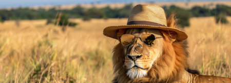 A lion in sunglasses and a hat in the savannah: safari adverts, copy space, banner.