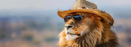 Lion in straw hat, sunglasses: safari ad concept, banner, text space.