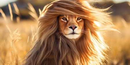Close-up of a majestic male lion, its mane bathed in the warm glow of a setting sun. A lion with a long mane and a golden face stands in a field of tall grass
