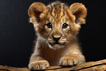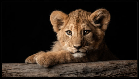 A close-up shot features a lion cub resting on a wooden surface. The cub's golden fur contrasts with the dark background. The lighting highlights the cub's features, emphasizing its focused gaze. This image is suitable for various commercial uses, including advertising and editorial content.