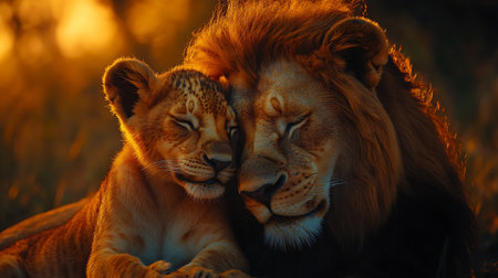 A lion lovingly nuzzles its playful cub during a golden sunset in the savanna.