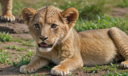 A young lion cub resting on ground, showcasing its playful nature and curiosity