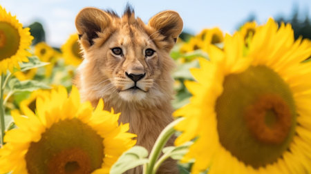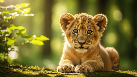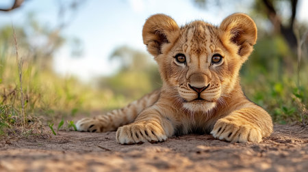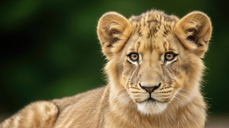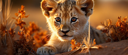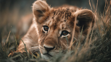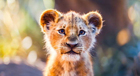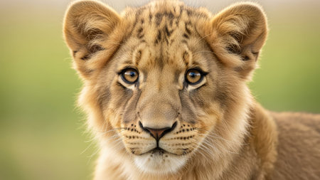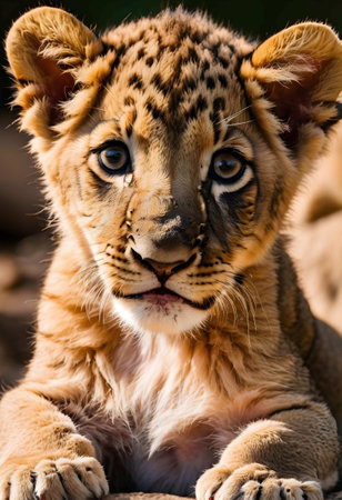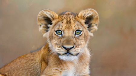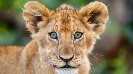 An adorable young lion cub displays its charming features in a captivating close-up. The enchanting eyes and playful expression highlight the beauty of wildlife in a natural setting.