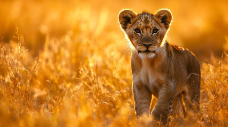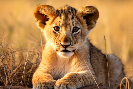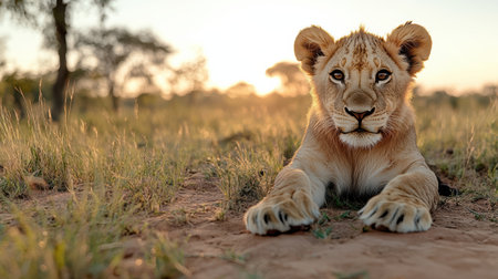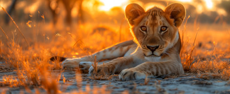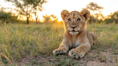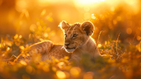 A young lion cub lying on the savannah, illuminated by warm golden sunlight