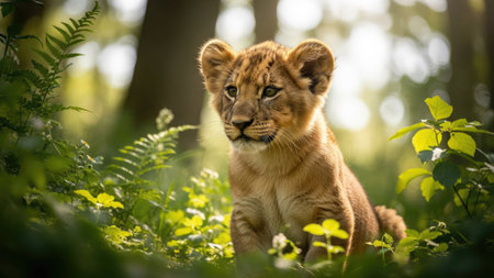 Lion cub sitting in the grass in the forest. Wildlife scene from nature.