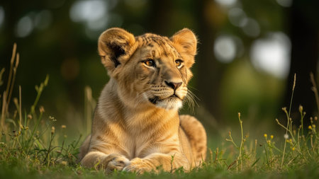 A majestic lion cub resting in tall grass during sunset, exuding calmness