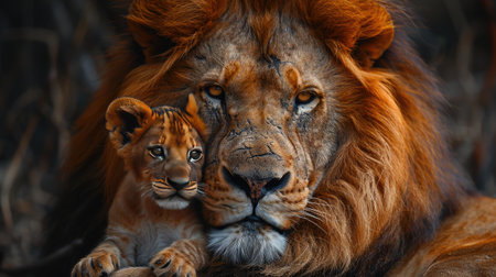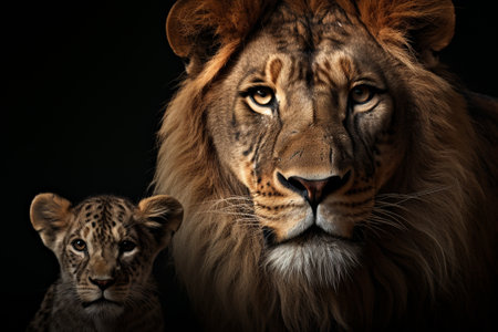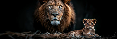 Majestic male lion and lion cub portrait with space for text, object on right side