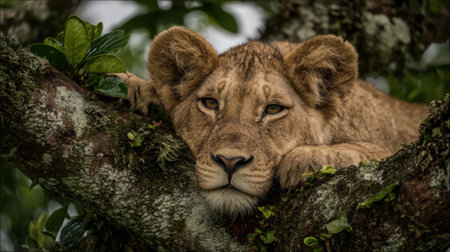 A young lion cub with golden fur rests its head on a mossy tree branch, its eyes gazing calmly. The lush green foliage surrounds the cub, creating a serene natural habitat.