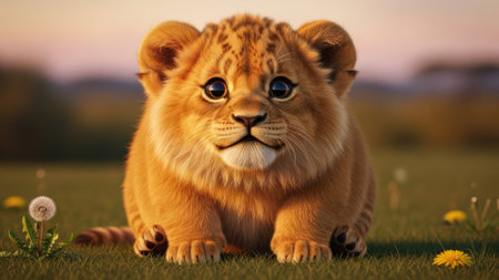 A close-up captures a lion cub sitting in a field. The cub's warm-toned fur contrasts against the green grass and blurred background. Gentle lighting and a soft focus create a tranquil atmosphere. Suitable for use in various visual projects, including educational and promotional materials.