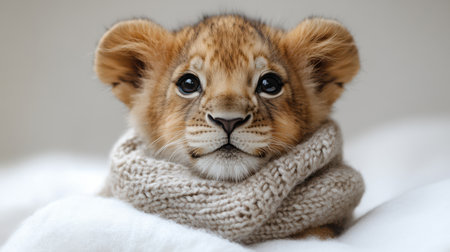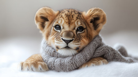 Lion cub with a tiny scarf, cozy winter look, white backdrop, soft fabric texture, heartwarming and cute, studio lighting