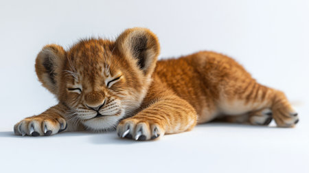 Lion cub stretching, tiny claws extended, white background, adorable morning routine, crisp details, warm tones