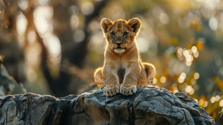 Young Lion Cub Resting on a Rock in a Sunlit Natural Habitat During the Afternoon Hours in the Wilderness. Generative AI