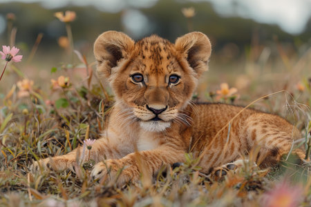 A moment of peaceful repose, highlighting the lion cub's serenity amidst nature's beauty