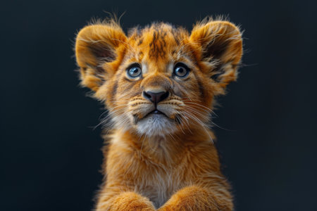 A close-up portrait showcases a young lion cub with a rich brown coat. The cub is positioned in front of a stark black background. The image has a studio-style appearance with focused lighting. This photograph is ideal for various commercial and editorial projects.