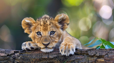 This stunning close-up captures the curious expression of a young lion cub resting on a wooden log, surrounded by lush greenery. The detail of its fur and eyes conveys a sense of innocence and playfulness, making it a perfect wildlife photograph for nature enthusiasts.