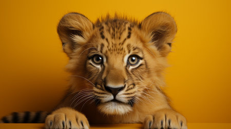 a baby lion, captured in a photographically detailed portrait style, lies on a vibrant yellow background. this high-quality national geographic photo showcases the intricate character design of the lion, reminiscent of the bengal school of art. taken with a konica big mini camera, the image has been digitally enhanced to further enhance its visual impact. ai generated
