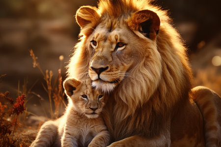 a lion standing protectively in front of his baby, nestled safely underneath, symbolizing strength, love, and familial bonds in the animal kingdom