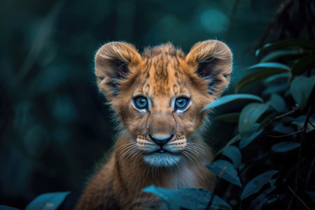 This stunning close-up captures the essence of a young lion cub with mesmerizing blue eyes and soft fur, showcasing its curiosity and charm in a beautiful natural setting.