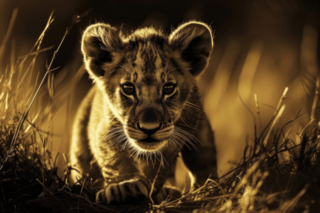 This image features a detailed close-up of a lion cub, its fur rendered with intricate textures. Warm lighting highlights the cub's features against a blurred, dark background. The image has a naturalistic style and composition, and could be utilized in various commercial and editorial projects.