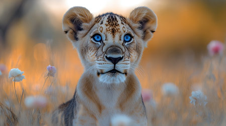 A young lion with blue eyes curiously looks over flowers at sunset.