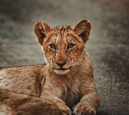 Lion cub looking at the camera in the Kruger National Park, South Africa.