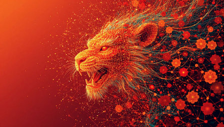 Roaring lion portrait showcasing golden fur and intense gaze