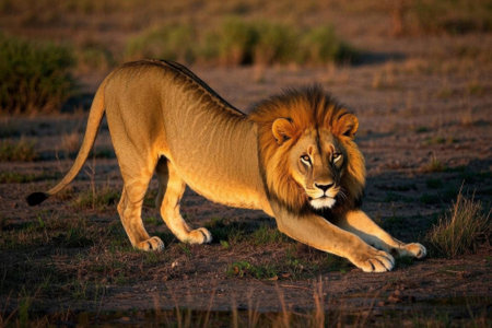 Close up of a male lion roaring, showing its powerful presence and dominance in the african savanna during a golden sunset, creating a captivating wildlife portrait