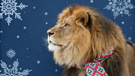 Lion in a scarf on a blue background with snowflakes