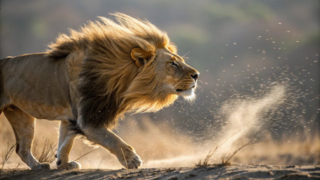 Majestic lion running through a vibrant autumn forest. Concept of wildlife, nature, big cats, animal kingdom, seasonal change, predator in motion, blur, speed.