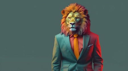 Cool Lion in suit and tie. luxurious mane. Isolated on solid background. Business concept. Fashionable animals. Head. Boss. Portrait. Bright colors. Copy Space. 3d illustration