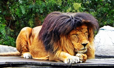 Closeup solemn big male Lion lying on artificial wood bench with green nature background.