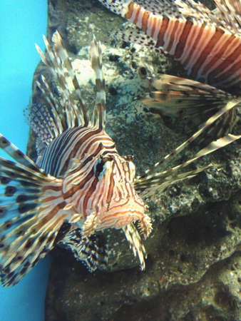 Close up of Lion fish swimming in blue water. Fish in aquarium.