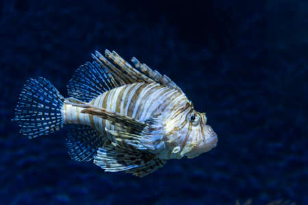 Marine life concept. Lion fish (pterois miles) in captivity, swimming on marine background.