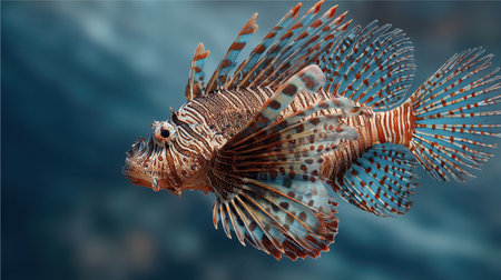 3d render of a lionfish swimming in the water with blue background