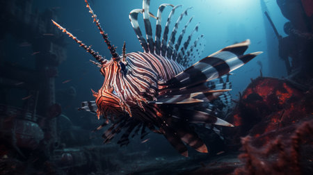 Closeup lionfish gliding shipwreck scene