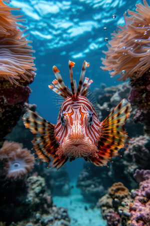 A vibrant lionfish glides through a colorful coral reef, showcasing its majestic fins and unique patterns. An exquisite view of underwater life.