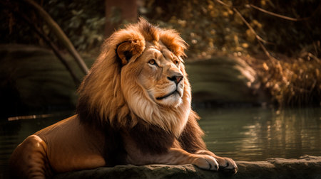 Majestic lion by the water. Generative AI illustrator