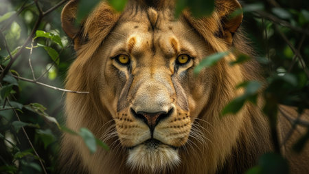A stunning close-up portrait of a lion showcases its majestic features and fierce expression, highlighting the natural beauty and allure of wildlife.