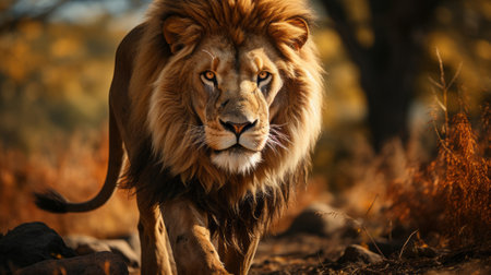 Majestic lion with a flowing mane is illuminated by the warm autumn light