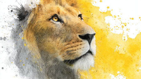 A lion with a yellow background. The lion is looking at the camera. The background is splattered with paint