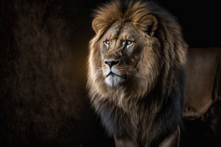 male lion king with a lush mane on a dark background. Copy space for text
