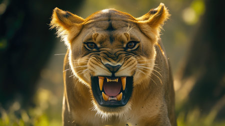 angry lioness roaring and showing teeth in savanna on a clear dark background. Serengeti park, Tanzania