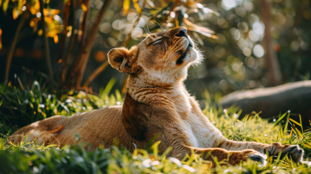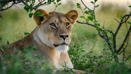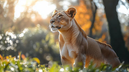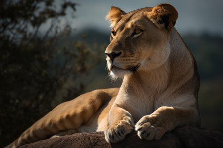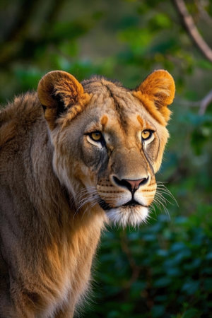 Lioness basking in warm sunlight gazing thoughtfully on an African savannah surrounded by vibrant foliage. The golden afternoon casts a magical glow across the landscape.
