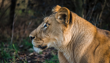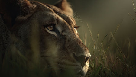 A close-up shot captures a lion's profile with intense gaze. The image features warm tones and soft lighting, highlighting textures. This photograph suggests a natural environment with tall grass in the background. It could be useful for editorial articles and commercial projects promoting wildlife.