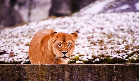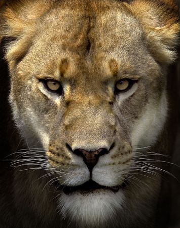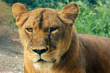 Portrait of an adult lioness, with a stern look. Close-up. A family of cats.