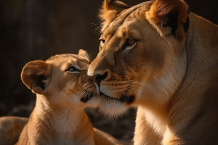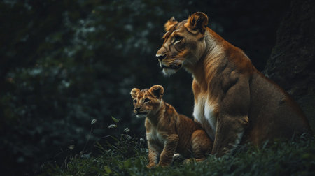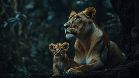 lioness sits protectively her small cub shadowy forest showcasing their bond amidst tranquil and mystical atmosphere.