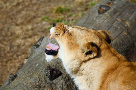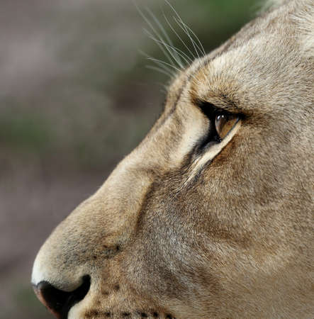 Close up portrait from side face ferocious carnivore female lion, stare or looking straight forward at the savannah desert background.