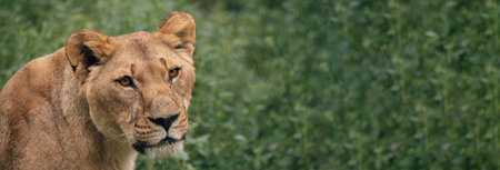 Portrait of serious lioness hunting in the forest. Beautiful animal on fresh green grass field, big five, game drive, beauty of wildlife.